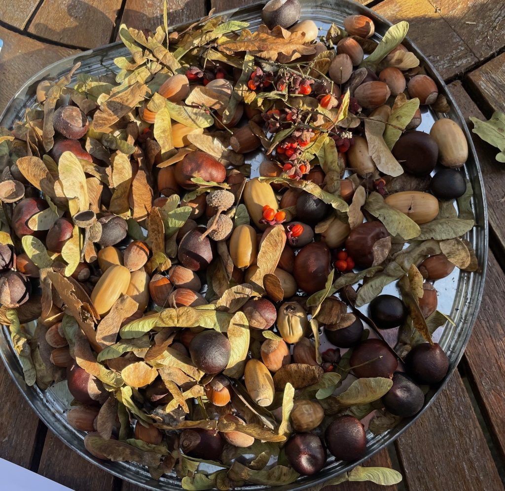 We asked the children to tell us what trees do – and it was great to find that a good number of these 9 and 10 year olds knew a lot already! We gave each of them a postcard with pictures of a tree, its flowers and fruits and asked them to hunt for its fruits or nuts from one of our baskets – we had acorns, crab apples, maple ‘helicopters’, conkers and hazel nuts. They just loved feeling the different textures and enjoyed the absolute beauty of acorns and conkers! For me, the best thing of all was when a 9 year old boy thoughtfully stroked a hazel leaf and said ‘If I dyed my hair green, could I catch the sun’s energy too?’