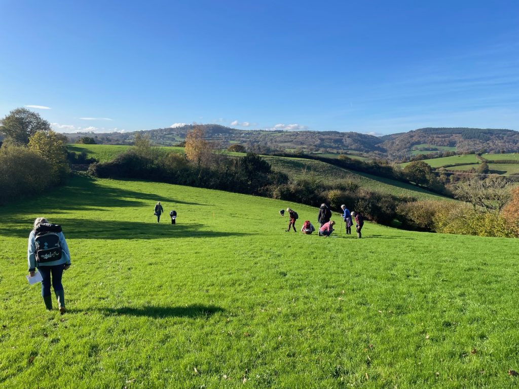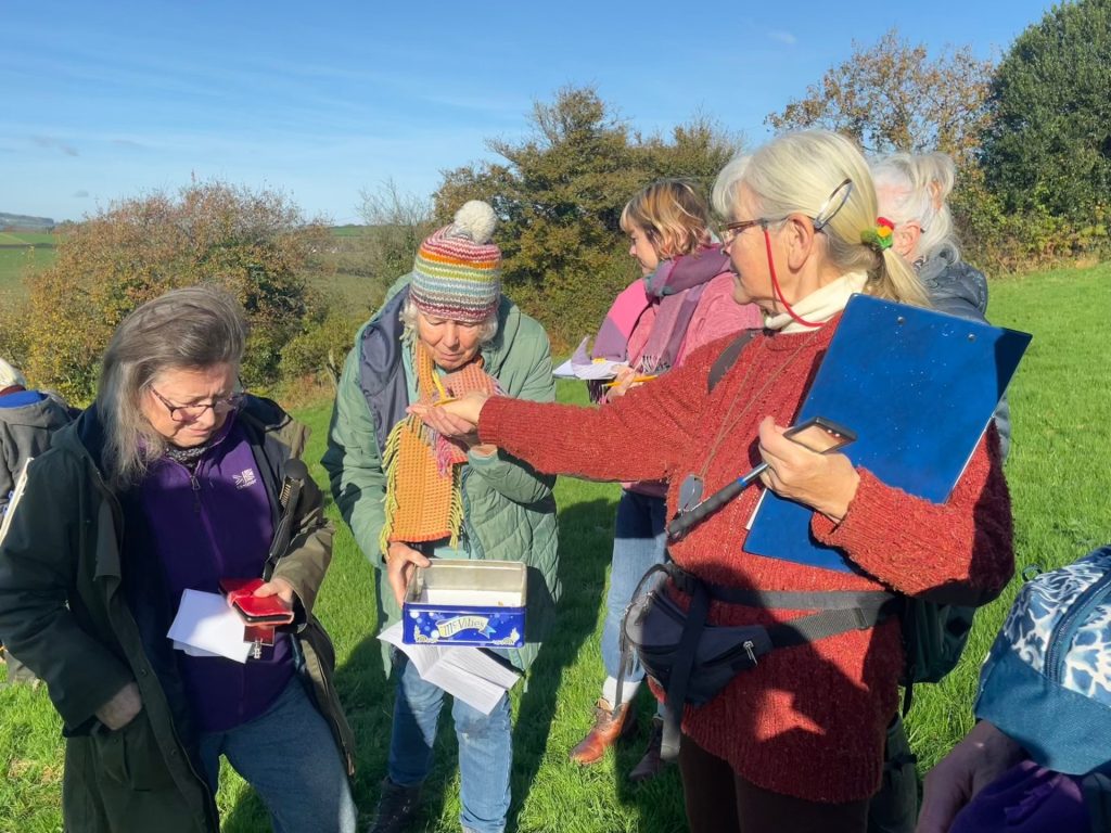 Waxcaps are rare treasures of unimproved grasslands and with over 20 different species recorded, Deer Park farm is a nationally important site. During our walk, we talked about the fungal indicator species, grouped under the acronym CHEGD (derived from their scientific family names) which include spindles, clubs, waxcaps, earth tongues, pinkgills, and crazed caps. These fungi thrive in low-nutrient, unimproved grasslands making them good indicators of traditionally managed land. Plantlife run a “Waxcap Watch” every year and by tracking the presence of waxcaps and other CHEGD species, we can gather valuable data to help protect and manage these rare grassland ecosystems more effectively.