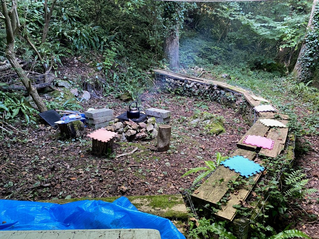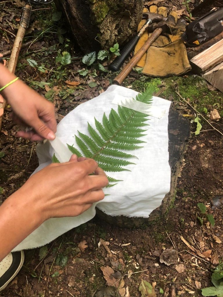 In August I ran a training session in my little woodland all about nature based activities for children. Luckily we were blessed with great weather! We talked about health and safety around working with young people and considering the weather conditions and season when planning activities. I laid out lots of my resources and offered the group a chance to have a good look through for ideas. After this I demonstrated some activities and encouraged others to have a go too. We tried out making Nordic slinging bracelets, making beads (or snakes or handles for bubble wands) out of pieces of elder, hapa zome printing using ferns and making “poo” from a mix of flour, soil and water to investigate signs animals have been present.