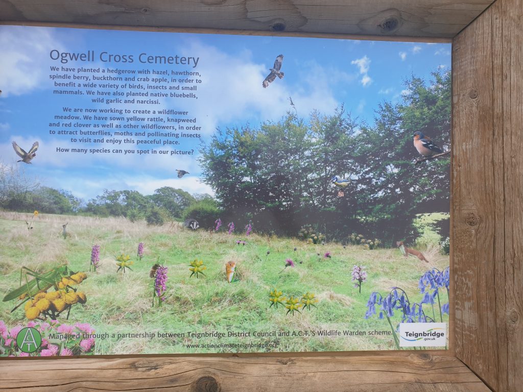 Christine Callard, a Wildlife Warden for College Ward (Newton Abbot), gained permission from Teignbridge District Council to create a wildlife area at Ogwell Cross Cemetery. A native, species-rich hedge was planted with help from Ogwell Wildlife Wardens. Native spring-flowering bulbs were also planted as well as a variety of wildflower seed, including yellow-rattle, which is now established. With help from a friend and TDC, Chris designed and installed an information board. She also installed bird boxes and a bench so that visitors can sit and enjoy the wildlife. Many thanks to Cllr Janet Bradford, Cllr Jackie Hook and Cllr Gordon Hook for providing funding for this project.