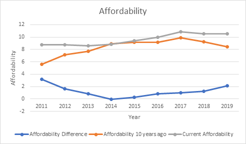 Both now and 10 years ago affordability has been falling, which means that houses are becoming more affordable. 10 years ago we were recovering from a financial crisis and in 2010 after the general election the housing market stalled, causing a low in house prices and so affordability.
