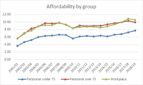 This suggests that affordability for older pensioners is about the same as for the working population, but affordability is substantially lower for younger pensioners. This only considers earnings, it does not consider the larger capital resources that pensioners can have in housing, pensions and other investments.