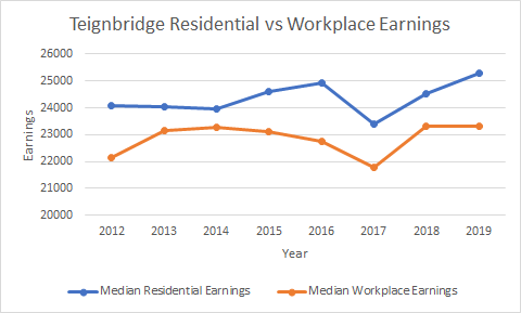 Residential earnings for Teignbridge are consistently higher that workplace earnings.