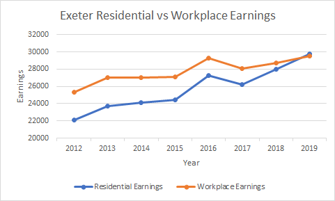 We have also considered the relationship of residential and workplace earnings in Exeter, and see an opposite relationship: