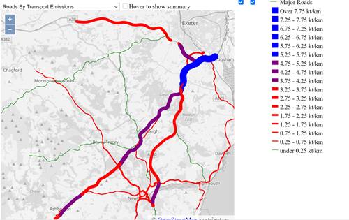 The following map shows these emissions allocated according to traffic flows in the road network in Teignbridge.