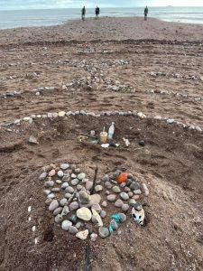 Those walking the labyrinth were invited to pick up a piece of rubbish found on the beach at the entrance, reflect on their concerns as they trod the meandering path to the centre, then leave the rubbish and their concerns there. They could then take a stone from the centre and walk back thinking of places precious to them.