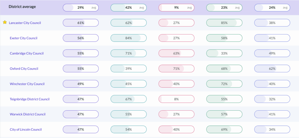 Devon County Council also scored well, coming third in the county council section with 50%. The top scorer in that section is Oxfordshire (53%). Devon did particularly well in the Buildings & Heating and Collaboration & Engagement sections.