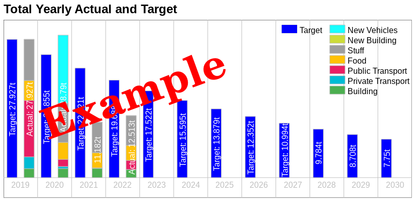 The results show your annual carbon footprint and your carbon budget. The budget shows the emissions ceiling to aim for to help keep global warming within safe limits.  The chart will look something like the one below, depending on how much information you have entered.