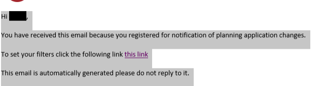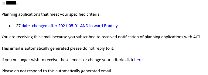 We have now provided a facility for those who have signed up for ACT emails to register for email alerts. This will allow you to specify a filter for applications you are interested in and frequency of alert.