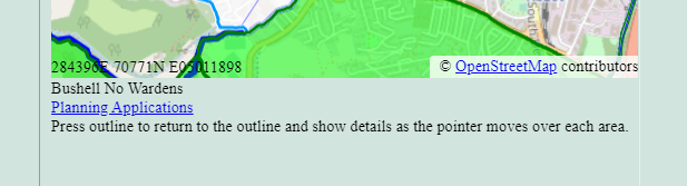 The Wildlife Warden’s map has a link for each Wildlife Warden area to planning applications related to that area, as shown below.