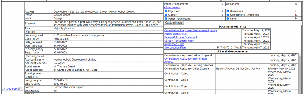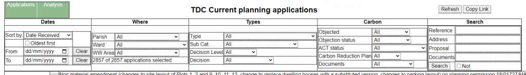 Teignbridge district council have a facility on their website that allows members of the public to search and view planning applications. This allows searching for applications by application number, postcode, map and advanced search. If you wish to find out about several applications using this facility, you need to navigate between pages many times. ACT has developed an application which enables you to see on one page: